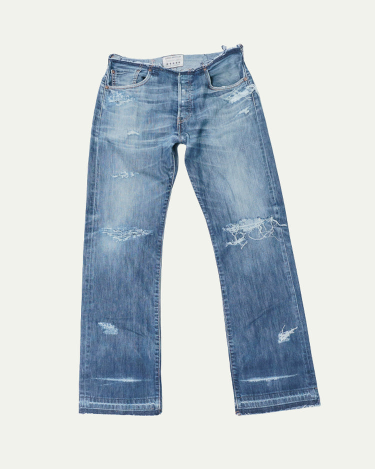 Our Trasher denim is constructed using vintage denim. Pairs are handpicked for their wash and detail. They are then washed and cut.