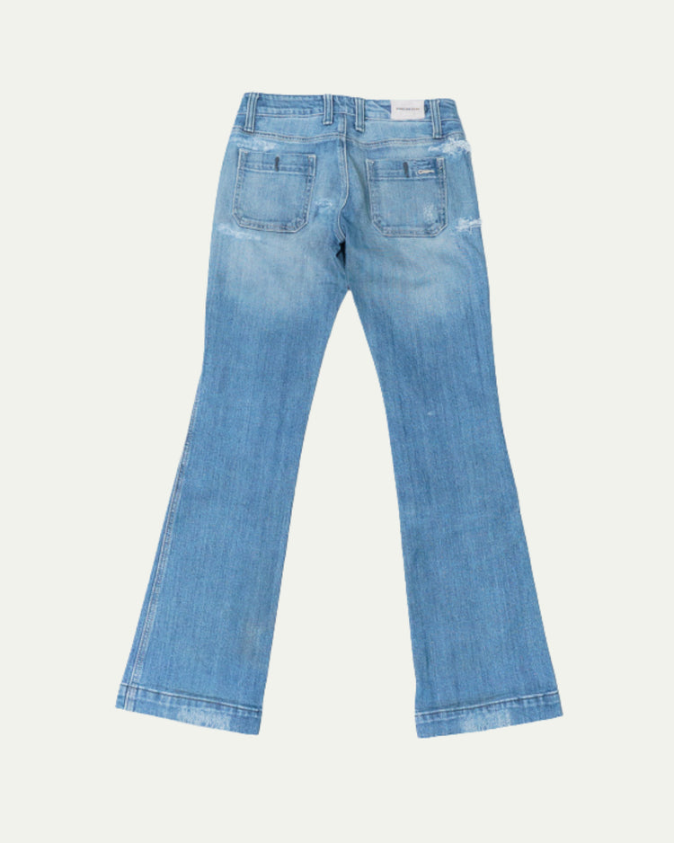 Our Trasher denim is constructed using vintage denim. Pairs are handpicked for their wash and detail. They are then washed and cut.