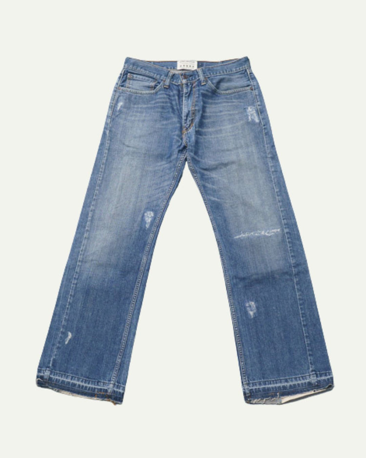 Our Trasher denim is constructed using vintage denim. Pairs are handpicked for their wash and detail. They are then washed and cut.