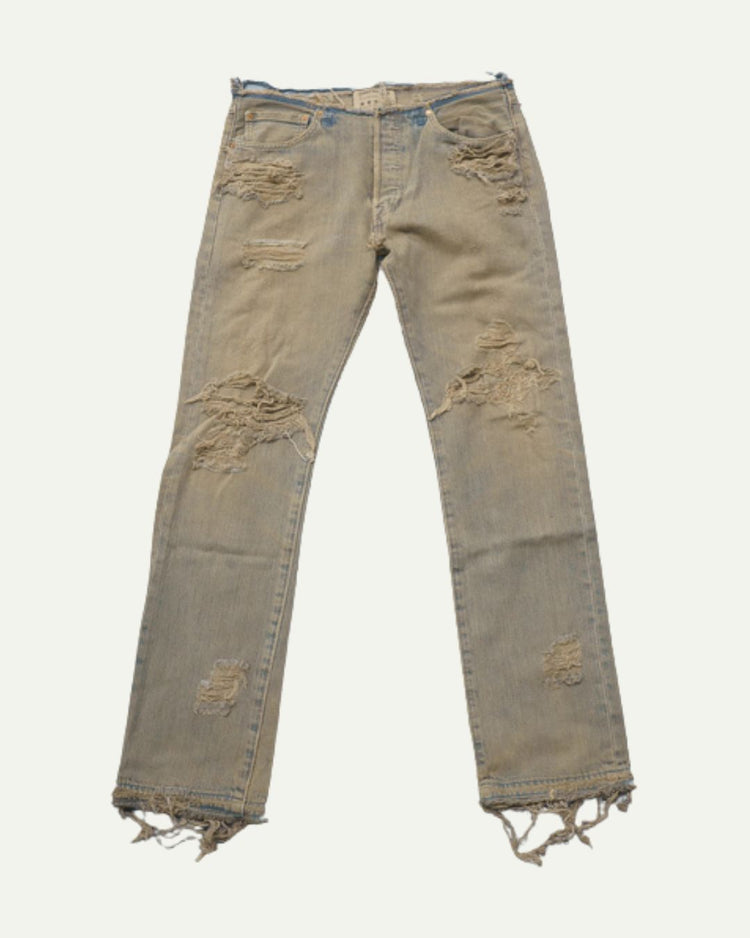 Our Trasher denim is constructed using vintage denim. Pairs are handpicked for their wash and detail. They are then washed and cut.