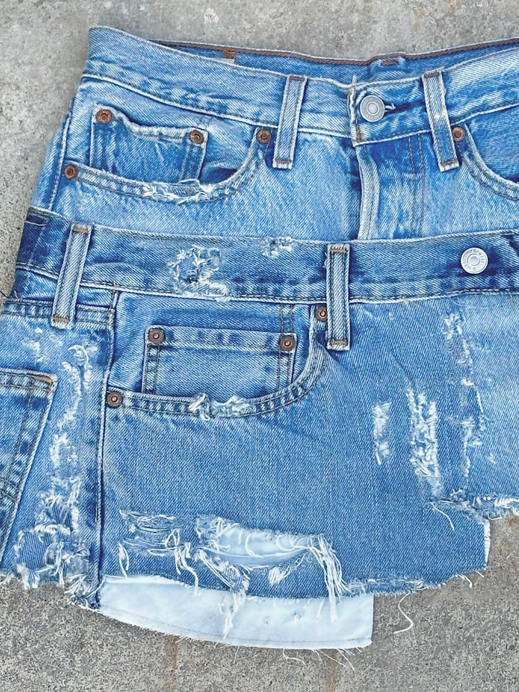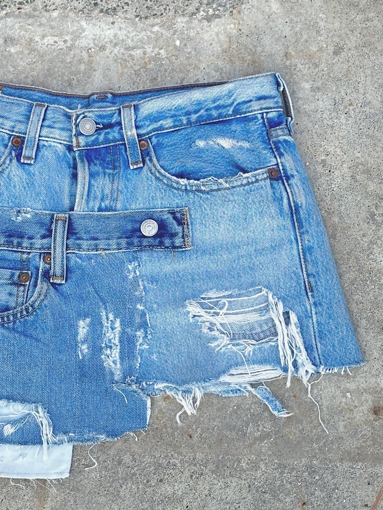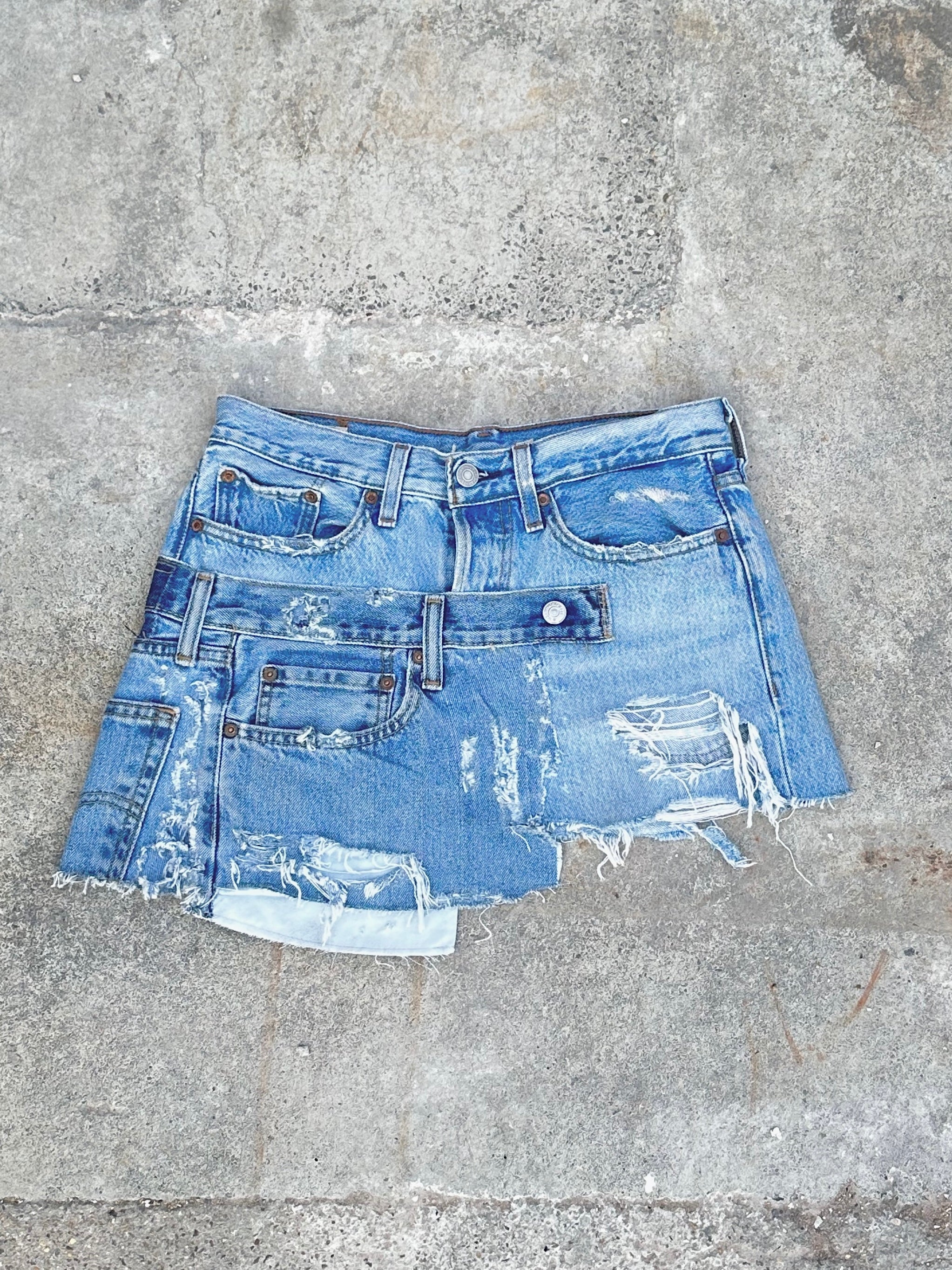 Inspired by California Punk culture, our Trasher mini skirt is constructed using 2 pairs of vintage Levis 501 denim. Pairs are handpicked for their wash and detail. They are then washed and cut.