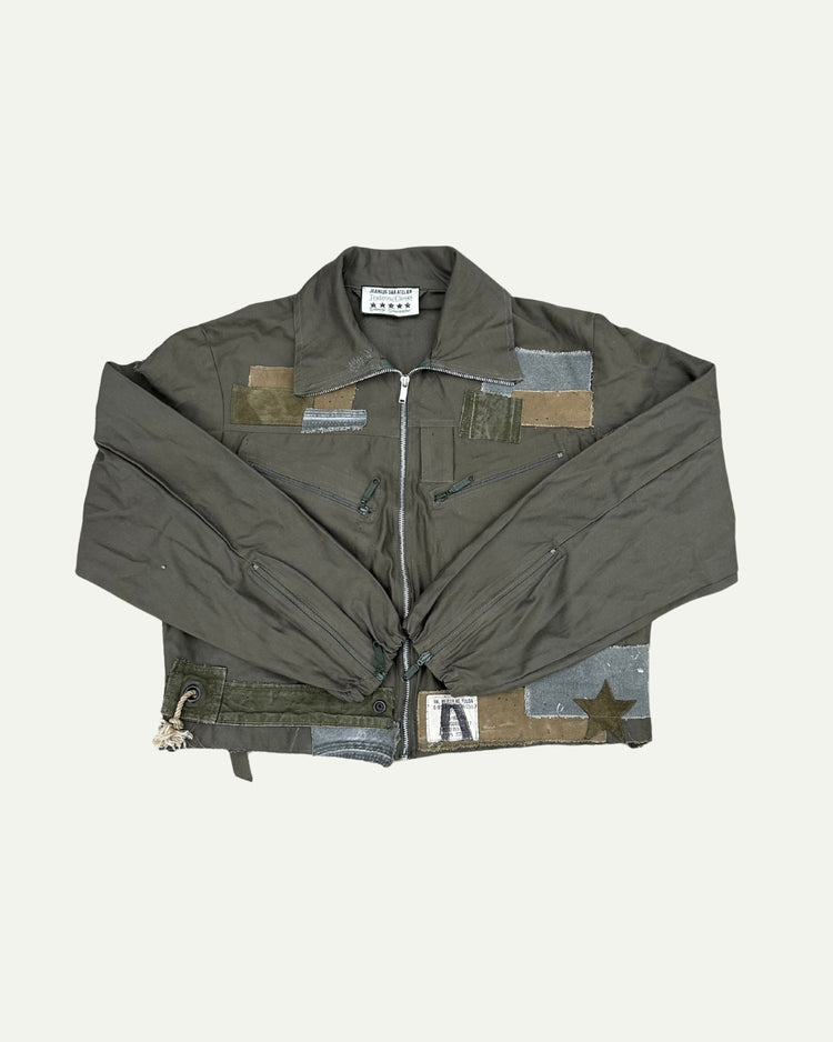 Patchwork cropped jacket crafted from vintage military fabrics.