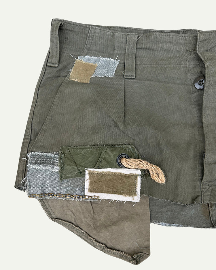 •Patchwork mini skirt crafted from vintage military fabrics.