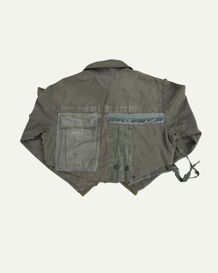 •Patchwork cropped jacket crafted from vintage military fabrics.