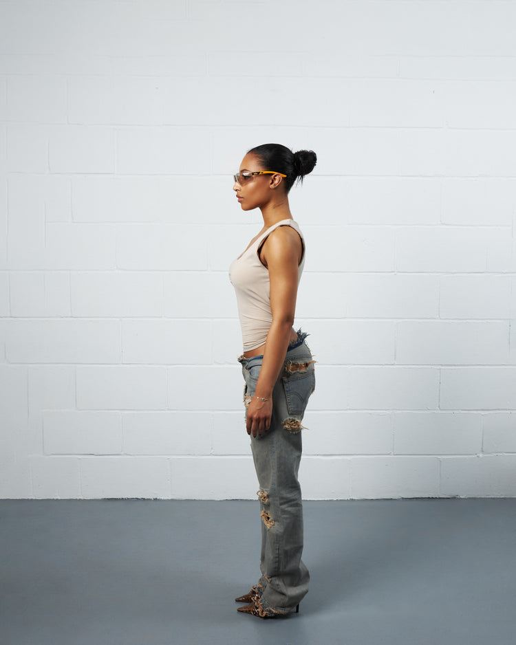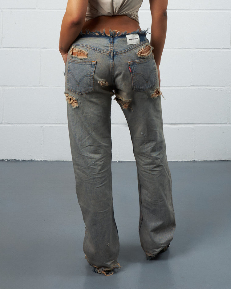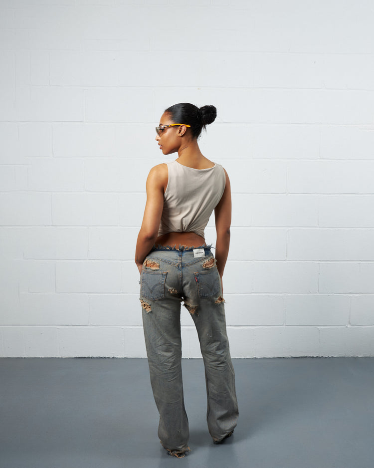 Our Trasher denim, inspired by California Punk culture, is constructed using Vintage Levis 501 Denim. Pairs are handpicked for their wash and detail. They are then washed and cut.