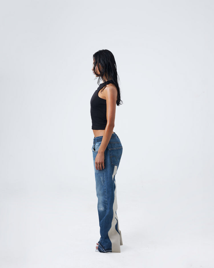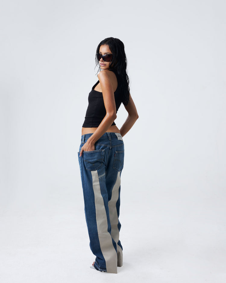 - Cream back panel insert creating subtle flare & baggy fit leg