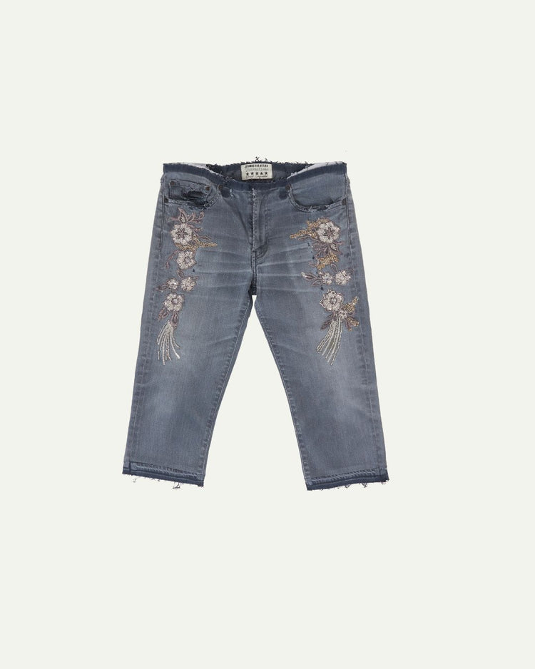 Crafted from handpicked vintage denim, every pair features custom embellishments that are individually cut and meticulously hand-stitched in our London studio. No two designs are alike, making each piece truly unique.