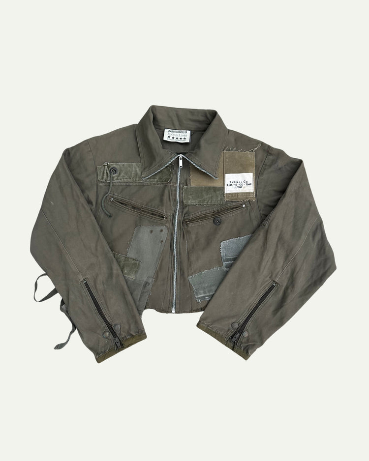 Patchwork cropped jacket crafted from vintage military fabrics.